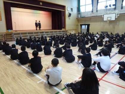 「今日は中本小学校第137回、創立記念日です。この学校が137年続いてきたのも、多くの人が支えてくれたおかげです。」から始まり、終わりは「これから入ってくる後輩の皆さんに素晴らしい中本小学校を引き継いでいきましょう。」としめくくられていました。