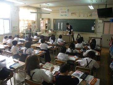 1年生は算数「たしざん」です。いつもと雰囲気が違うからか、子ども達は緊張した顔で授業を受けていました。