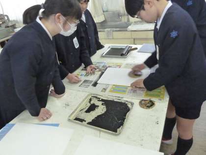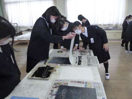 版画板を彫り終わった6年生の人たち。この時間はインクをつけて刷りの工程です。