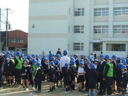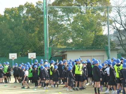 縦割り班ごとに整列しているのはこれまでと同じですが、6年生に代わって5年生がリーダーとしてゼッケンをつけています。