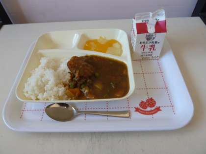 カツカレーライス、フルーツゼリー、牛乳 です。