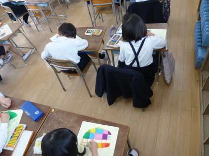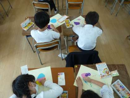 おとなりどうしで同じ色にならないようにどの色をつかおうか、と子どもたちは考えながら作品に取り組んでいました。