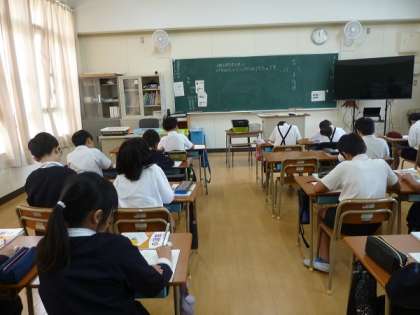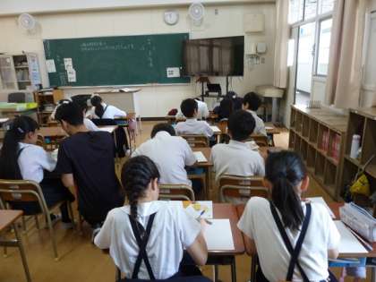 はじめに日常生活の中で小数が使われている場面を思い出し、それを文章にして書き表していました。先生から示された目標は6個です。子どもたちは一生懸命考えて、ノートに書き出していました。