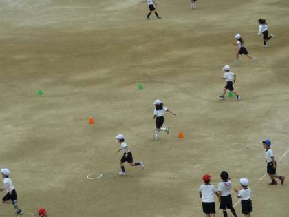 始めは普通に直線で走るだけ、そこからコーンを8の字のように曲がりながらゴールに向かったり、輪を跳び越えてゴールに向かって走ったりと少しバリエーションを変えて走る運動を楽しんでいました。