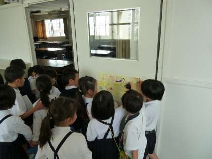 理科室、音楽室、わかば学級前での様子です。