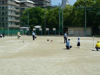 お話の後は、実際に運動場にかかれた模擬道路を使って、安全は歩行の仕方について実地練習を行いました。