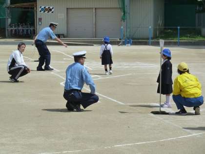 安全な歩行の仕方として、道路が交差しているところ、止まれとかいてあるところでは、道路に出るところで必ず右左を確認すること。