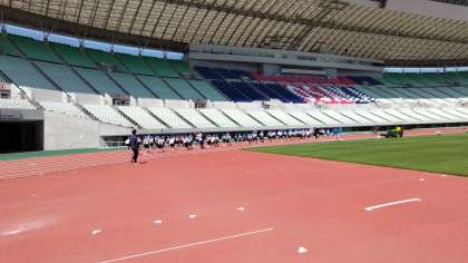 子どもたちはフィールドに入り、競技場の大きさを実感していました。子どもたちは100mを全力で走っていました。