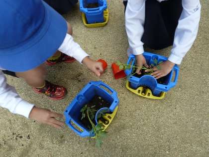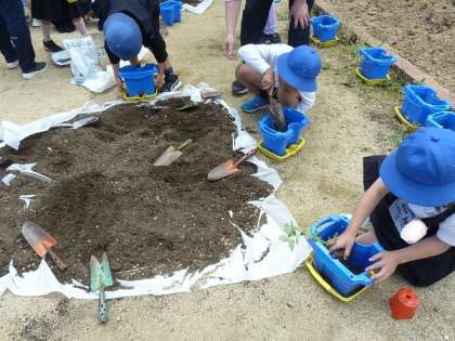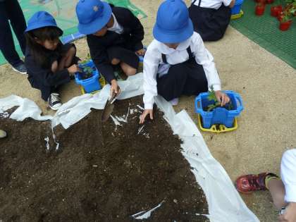 2年生がそれぞれの鉢に土を入れて、ミニトマトの苗を植えていました。これから各自で水やりなどのお世話をして、無事に育ったミニトマトが収穫できるように取り組んでいきます。