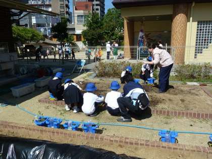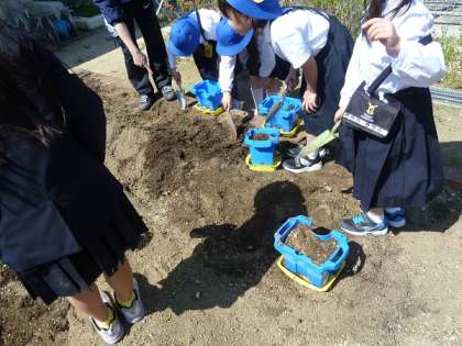 先週の金曜日、お天気のいいところでハチに土を入れ、その後、肥料、アサガオの種を土の上にまいていきました。最後に土をやさしく上からかけていました。