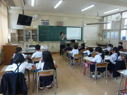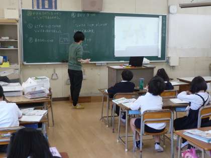 この時間は、みんなで同じ紙のものさしを用いて、目盛りの何個分で物の長さを表すという活動を行っていました。