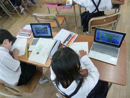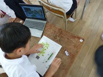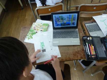 子どもたちはタブレットで写真を保存して、それを教室に戻って絵を描いたり、言葉で成長の様子を書いたりしていました。