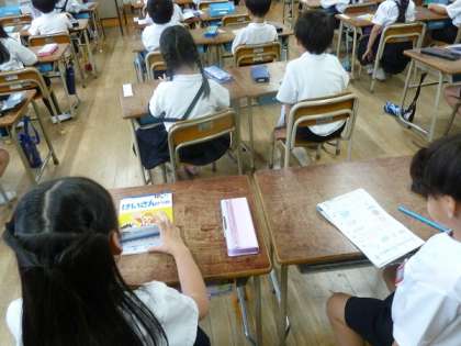 1年生のこの時間は、算数の「いろいろな かたち」の練習問題や、国語のひらがなの練習をしていました。