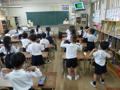 1年生の教室では、体をつかって振りをつけながら曲に合わせてダンスです。