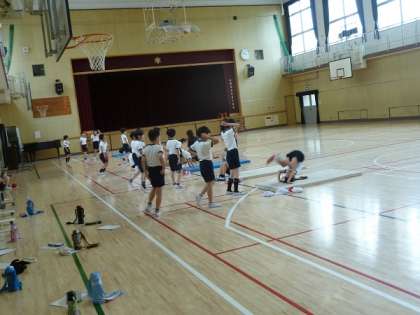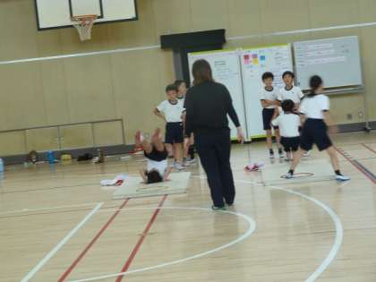 体を丸めて回る感覚を身につける、手の着く位置を確認するなど練習を通して運動に必要な動きを身に付けることができるよう取り組んでいました。