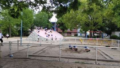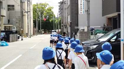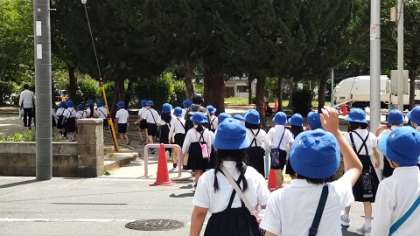校区を歩いて回り、公園でみんなで遊んで学校に戻ってきました。