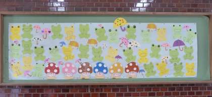 学校の玄関の掲示板には、たくさんのカエルたちが梅雨を待ちわびていました。
