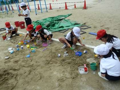 砂場の砂にバケツから水を混ぜて、子どもたちはいろいろなことをやってみて楽しく遊んでいました。
