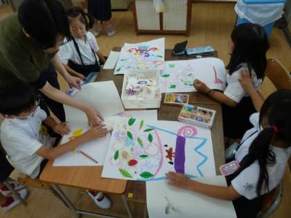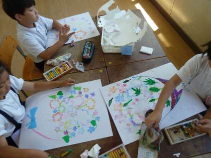 以前にも紹介した、2年生の図工で、「〇〇の花たば」というテーマで子どもたちは思い思いの花たばを描いていました。