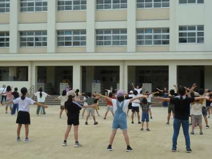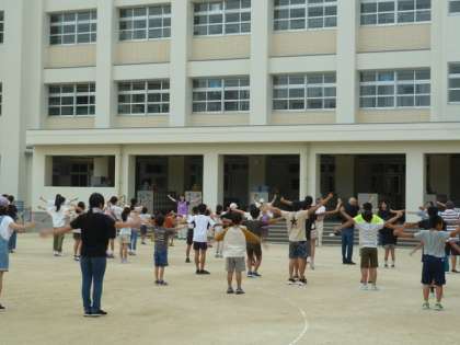 学校の校庭では、今週の金曜日までの1週間、PTAの方々がお世話してくださり朝の6時半からラジオ体操が行われています。