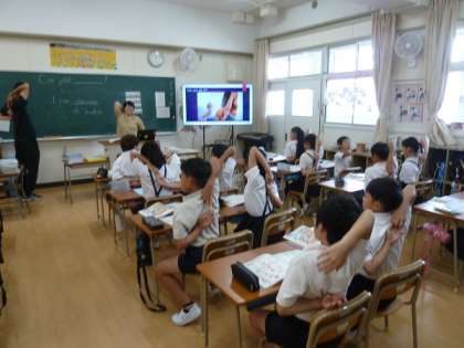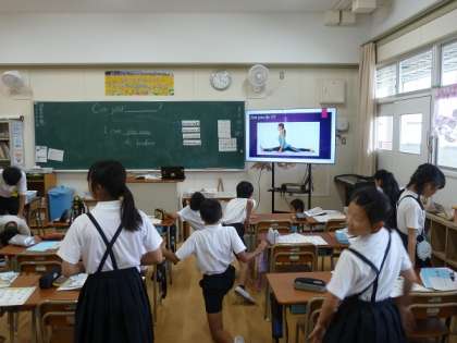 この時間は Can you 〜 ? に対して、Yes,I can や No,I can't. というやりとりを練習した後、モニター画面に映ったことができるかどうかを実際に自分でやってみて、できたらYes,I can.できなかったらNo,I can't.と発言します。子どもたちは必死になってモニターに映ったポーズを見て、チャレンジしていました。