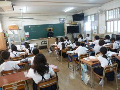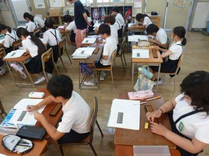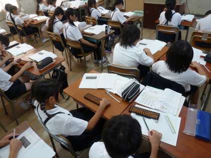この時間は、そろばんを使っての小数のたし算、ひき算の計算をしてみるというものでした。そろばんの玉が表す数について確認し、子どもたちはめいめいにそろばんの玉を使って小数を表していました。