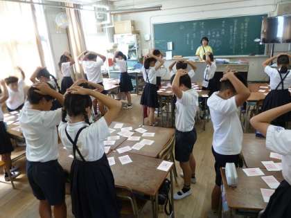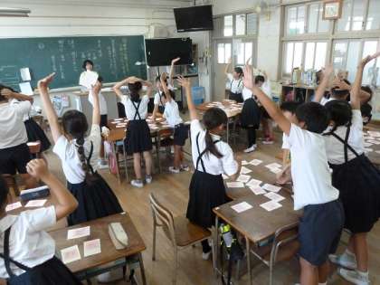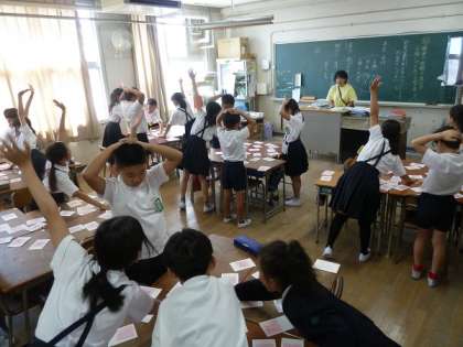 4年生で学習する漢字のカードを机の上に並べ、先生が言った言葉に使われている漢字をその中から見つけて取るというものです。