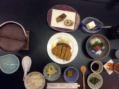 夕食の時間です。とんかつ、お造り、焼き魚、茶碗蒸し、小さなお鍋もあります。
