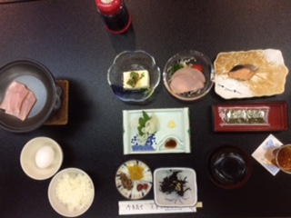 焼き鮭、イカ刺し、あおさの味噌汁など、今朝も盛りだくさんのおかずですね。
