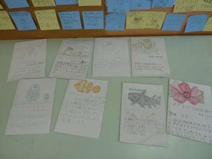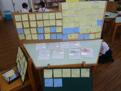 そのリーフレットを読んだ他の学年の子どもたちがポストイットに感想を書いてはりつけています。本から学んだことをこのように活かし、図書室に関連づける取り組みに感心しました。