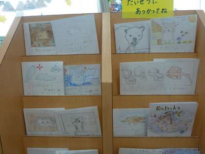 4年生の学習の取り組みで、図書室に4年生の子どもたちが作ったリーフレットが飾られていました。