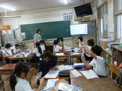 実験する前に立てた予想では、押すと縮んで、手を離すと戻るという予想が出ていて、実験用具を使って手で押した感触を確認していました。