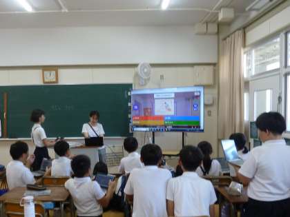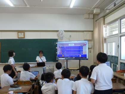 6年生の社会科の学習です。これまで学習してきたことのまとめとして、クイズに挑戦です。一人一人が自分のタブレットから答えを選んで解答します。正解した人は自分の得点となり、最終的に誰が一番ポイントが高いか、モニター画面で確かめることができます。子どもたちは熱中して取り組んでいました。