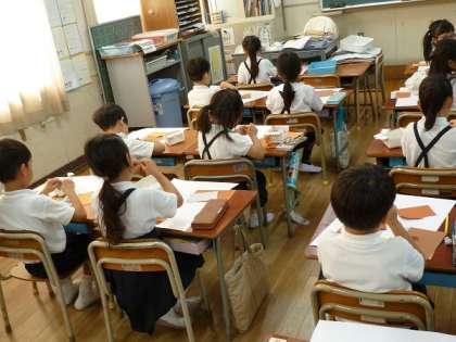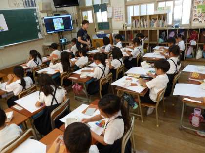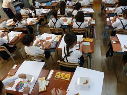 子どもたちは色画用紙をちぎっていき、ちぎった色紙を紙で作った入れ物の中にためていっていました。