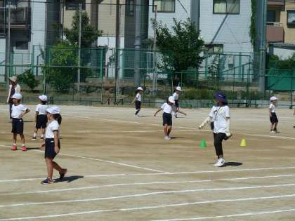 けりっこベースボールという運動をしていて、子どもたちはボールを足で蹴って飛ばすことができるように練習しています。
