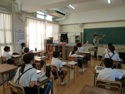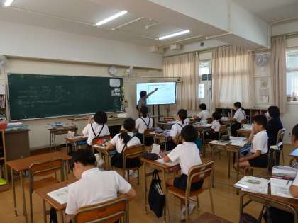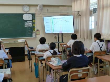 日本全国の5年ごとの人口の移り変わりを表したグラフを見て、グラフの読み取りについてまずは基本的な事柄を確認していました。縦軸と横軸が表しているもの、1975年の人口の数、そこから5年ごとの人口の数などを読み取り、人口の推移がどうなっているといえるか読みとる活動をしていました。