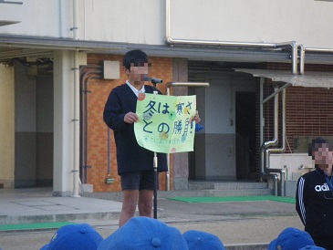保健委員会から子ども達へお知らせがあったのですが、そのあと運動委員会から「冬は寒さとの勝負!外で元気いっぱい遊びましょう!!」とダブルで寒さの中での過ごし方についての連絡がありました。