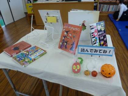 おすすめの本を紹介する図書室のコーナーでは、おばけや魔女など、ハロウィンを意識した題材の本が並べられていました。