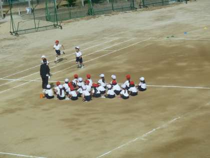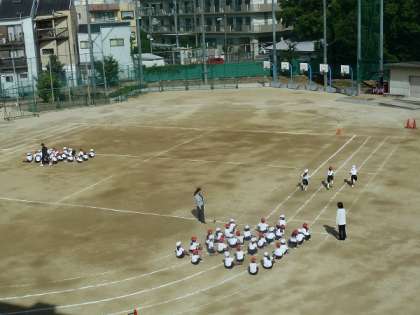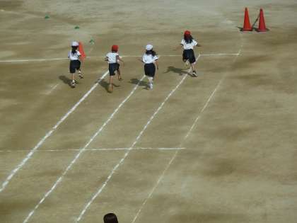 運動場で徒競走の練習をしていました。スタートの位置の確認をし、練習でゴールまで走っていました。