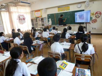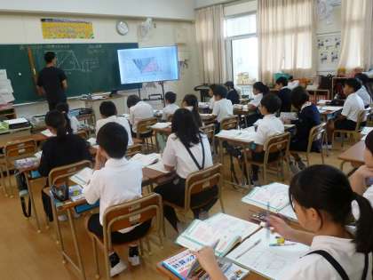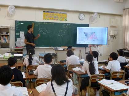 前の時間に学習した三角形の形をもとに平行四辺形の面積を求めていました。