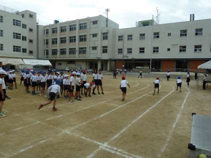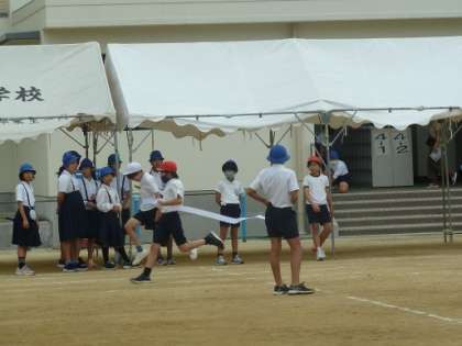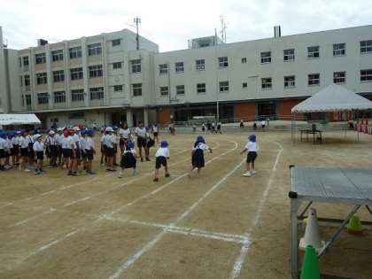 参加しようと集まった子どもたちは、男女、学年関係なく列にならんで4人ごとに走ります。子どもたちはそれでも走りたい!という人がたくさん運動場に集まっていました。
