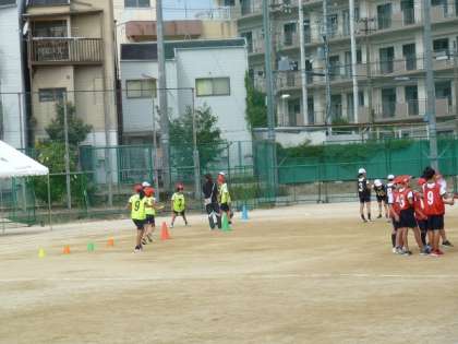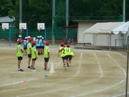 バトンパスのタイミング、受け方、渡し方をグループで練習していました。