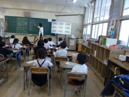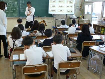 このように九九の唱え方を学習するだけでなく、式を見て、九九を使って答えを求めるという経験をします。覚えた九九を活用することで九九の便利さを感じさせ、定着を図っていました。