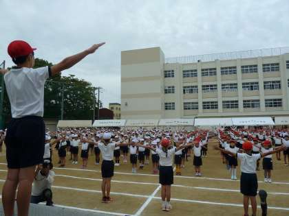 くもり空の下、雨が運動会が終わるまでもってくれることを祈り、予定通り開会式を始めました。