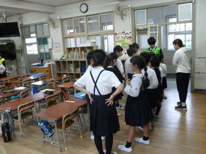 大阪城公園で班ごとに移動するときの並び方を確認したり、写真をとるときの並び方を確認したりしていました。