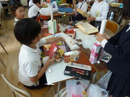 それぞれがお家から持ち寄った紙の箱が机の上にたくさん用意されていました。
