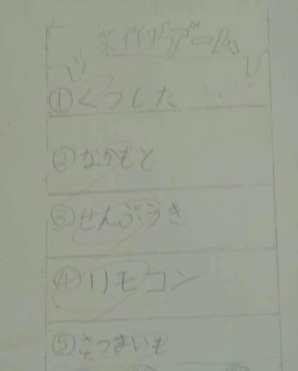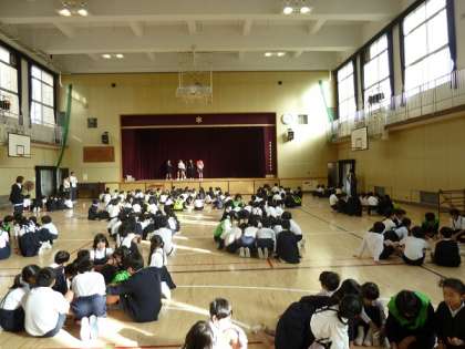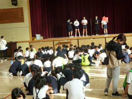 集会委員会が文字を一音ずつ発表します。出てきた文字を並び替えてするとある言葉ができあがります。それを班のみんなで考えるというものでした。