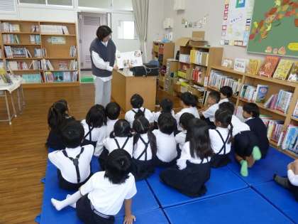学校司書の先生が低学年の人たちに読み聞かせをしてくれていました。