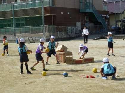段ボールの的にボールを当てて落とすゲームを通して、ボールを力強く投げることができるようにというねらいをもって行います。