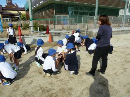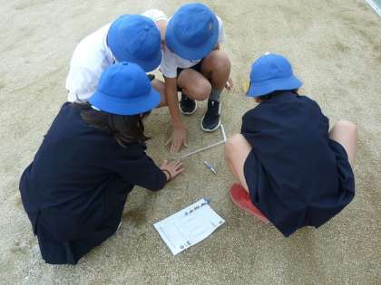 棒温度計を使って地面の温度の測定の仕方を学習し、子どもたちは温度を測っていました。